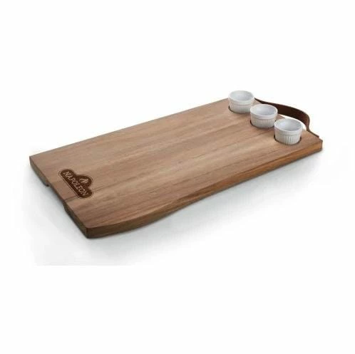 Made from genuine Acacia hardwood, this Charcuterie Board is large, stylish, and includes three ramekins for sauces and olives. The naturally occurring oils in Acacia hardwood provides resistance to liquid and microbes. Use the genuine leather handle to bring the board where it’s needed or use it for stylish storage.
