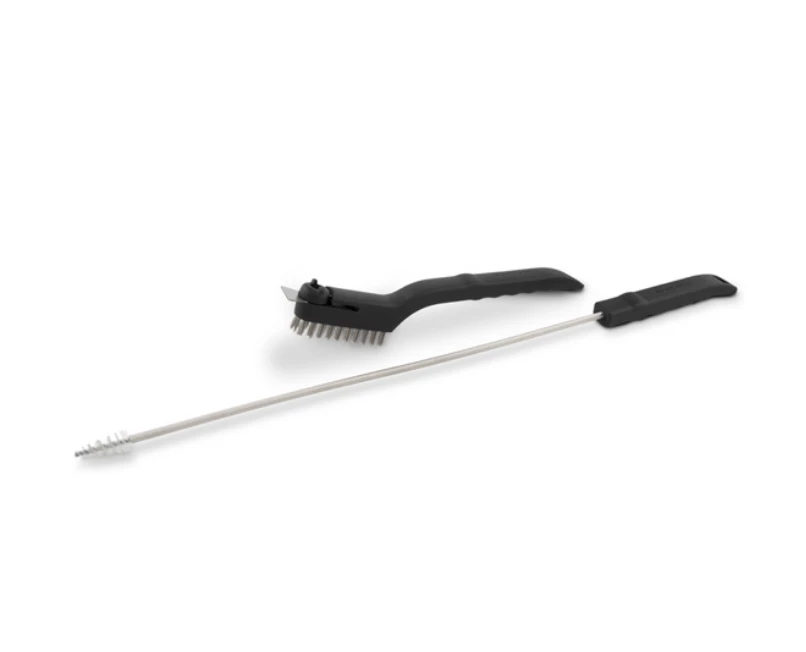 Burner health is the most critical component to cooking performance and even heat. Use the venturi brush to clean out the burners; bugs love to build nests inside them cutting off your gas flow. The fine detail brush is the easiest way to clean-up burners, the collector box, or any hard to reach spaces. The fine detail brush also has a needle tip to clean out any clogged burner tube holes – essential on rotisserie burner grills.