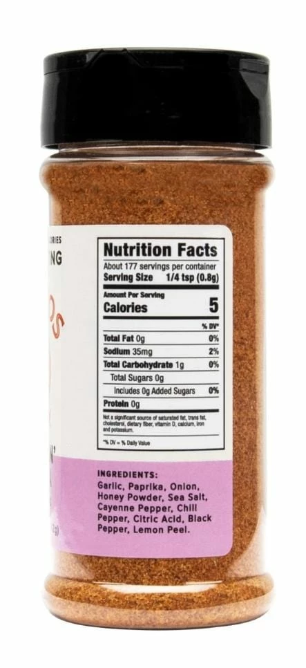 Ingredients: Garlic, Paprika, Onion, Honey Powder, Sea Salt, Cayenne Pepper, Chili Pepper, Citric Acid, Black Pepper, Lemon Peel