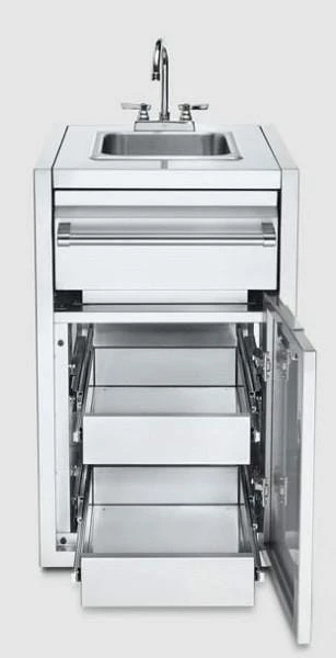 Crown Verity Infinite Series Small Built-In Cabinet with Sink & 2 Single Drawers. The Infinite Series built-in cabinet with sink is perfect for hand, produce and/or cutlery washing. It also has a paper towel holder and a storage cabinet with two (2) single drawer below to fully compliment this sink and your outdoor kitchen.