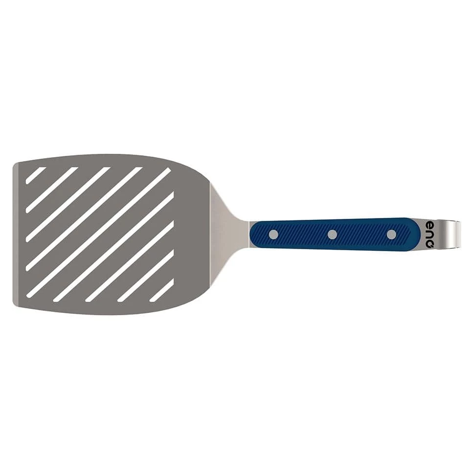 Perforated large angled spatula. Indispensable for handling juicy food without its fat thanks to the perforated surface.