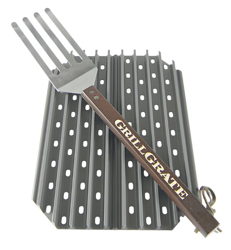 GrillGrates provide protected, high-heat grilling on most types of grills! The bottom plate prevent hot rushing air and flames from charring and drying out food, while keeping the juices sizzling instead of feeding the flames. GrillGrates are simple to use – just place them on top of your existing grate surface! Every set comes with a GrateTool which is part fork, part spatula that fits between the rails to get under your food and lift it without scraping.
