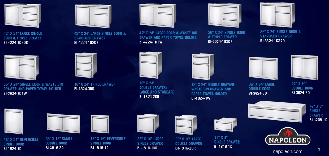 Creating your own custom grill island has never been easier with Napoleon’s Built-In Components. Every great outdoor kitchen needs storage; this large single drawer is 18″ x 16″, nice and deep for pots and pans. It features stainless steel construction, soft closing hardware, seamless trim, and anodized aluminum handles.