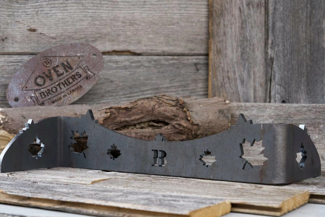 The trendy Oven Brothers Log Holder! Made of sturdy laser-cut carbon steel, this holder will hold your wood in place with its maple leaf spikes and shape. Behold the Holder!