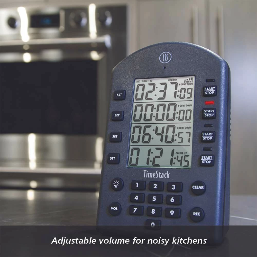 TimeStack is a professional timer found in commercial restaurant kitchens. Set alarms quickly with numeric keypad without fiddling with up/down or scrolling buttons. Four distinct alarm sounds tell you what timer is alarming, or record your own voice-alarm for each channel and call out which dish is ready.