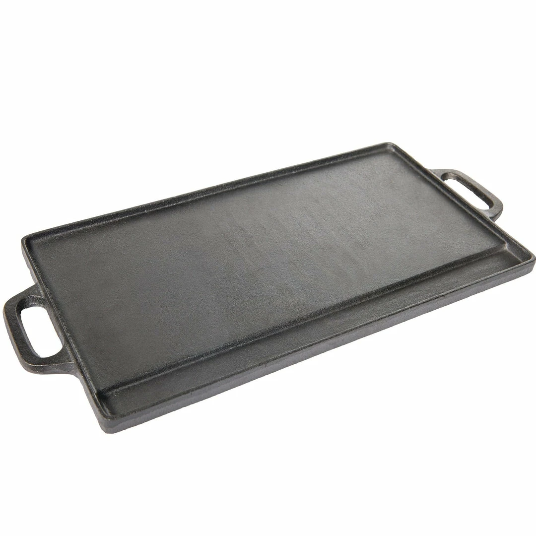 This versatile piece of cast iron cooking equipment makes cooking outdoors simple. Itโs pre-seasoned, double sided, and distributes heat evenly for epic grilling experiences. The ribbed side separates the fat content like a BBQ and is great for searing a steak, grilling chicken or burgers, and bacon. The smooth side is perfect for cooking pancakes, hash browns, and grilled cheese.