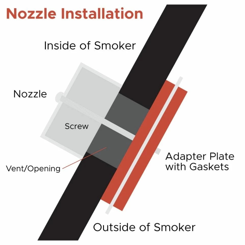 The FireBoard Blower Nozzle Adapter allows for the easy installation of the FireBoard Drive Blower on kettle style grills and smokers. The square nozzle rotates and can redirect airflow in any direction perpendicular to the fan. This is particularly useful in situations where a custom hole is drilled into the side of the grill to install a fan to control the fire.